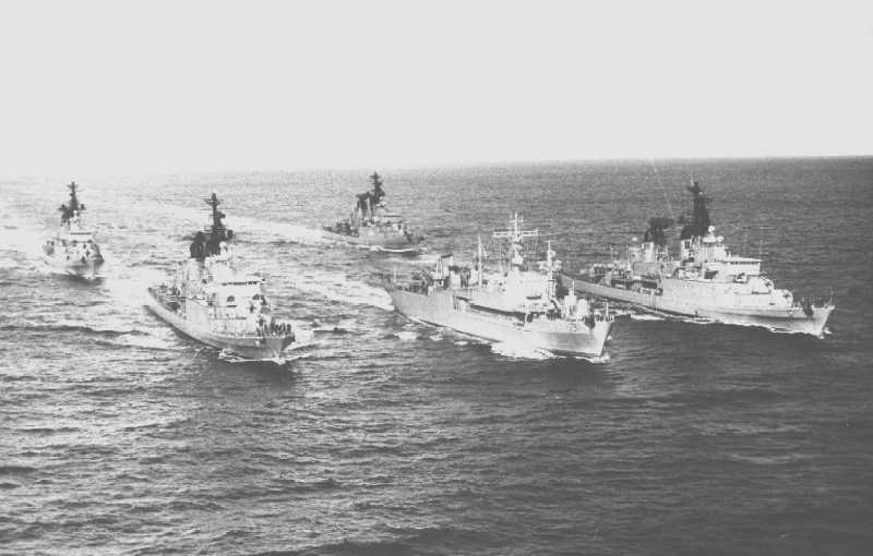 Komplette Hamburg-Klasse mit Versorger Freiburg (A1413) beim PHOTEX (Quelle: Die Bildstelle der Marine, Marineamt)